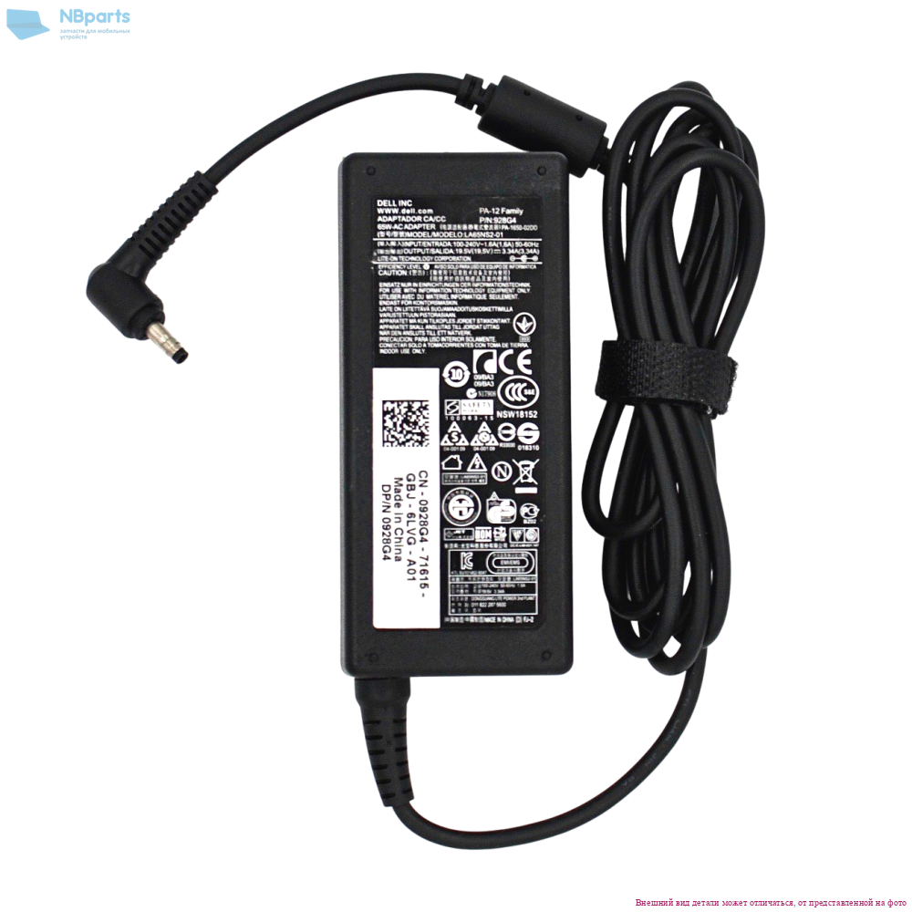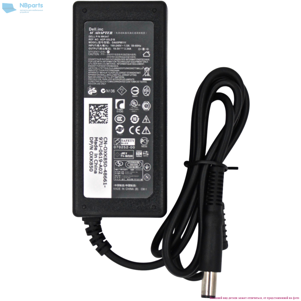 Блок питания (зарядное устройство) для ноутбука Dell 65W, 19.5V 3.34A, 7.4x5.0, 0JNKWD, копия без сетевого кабеля